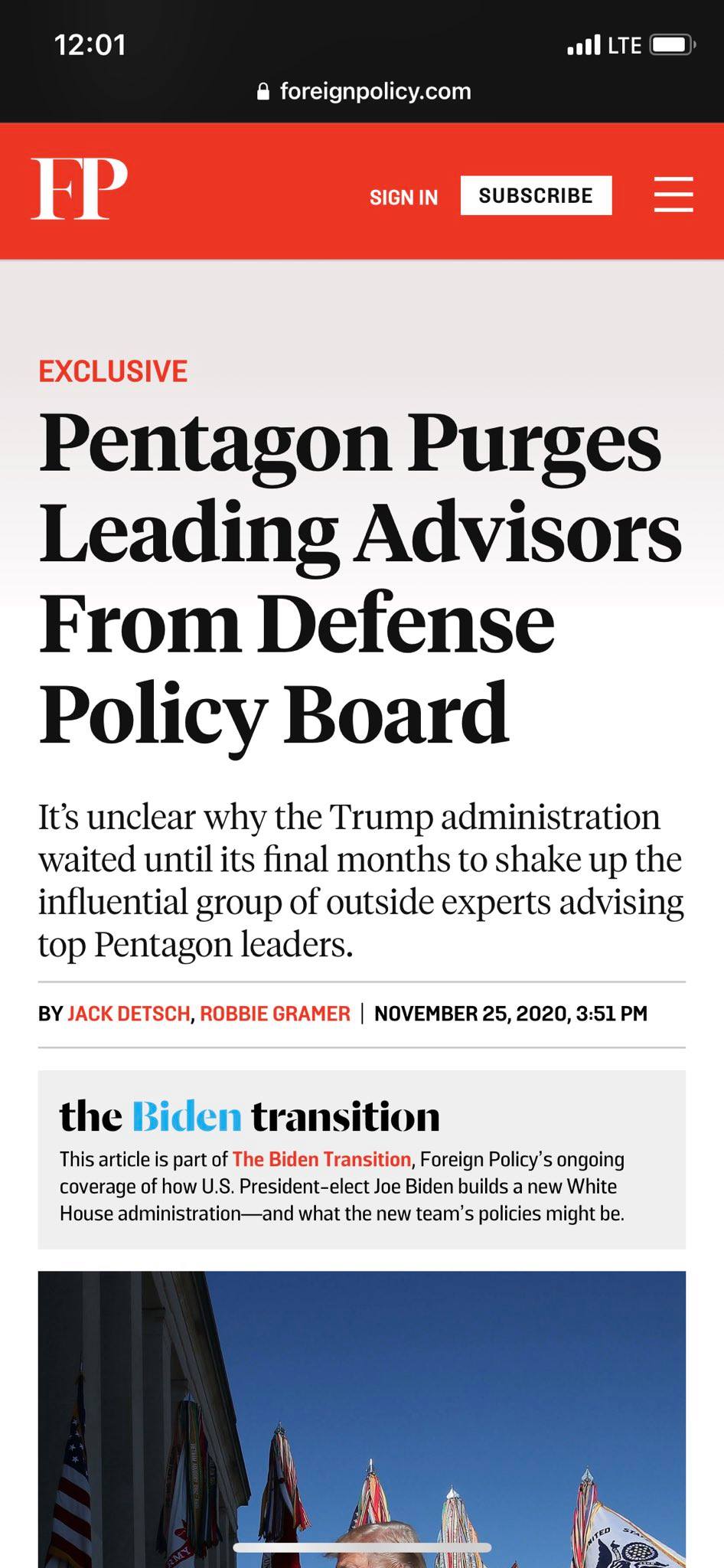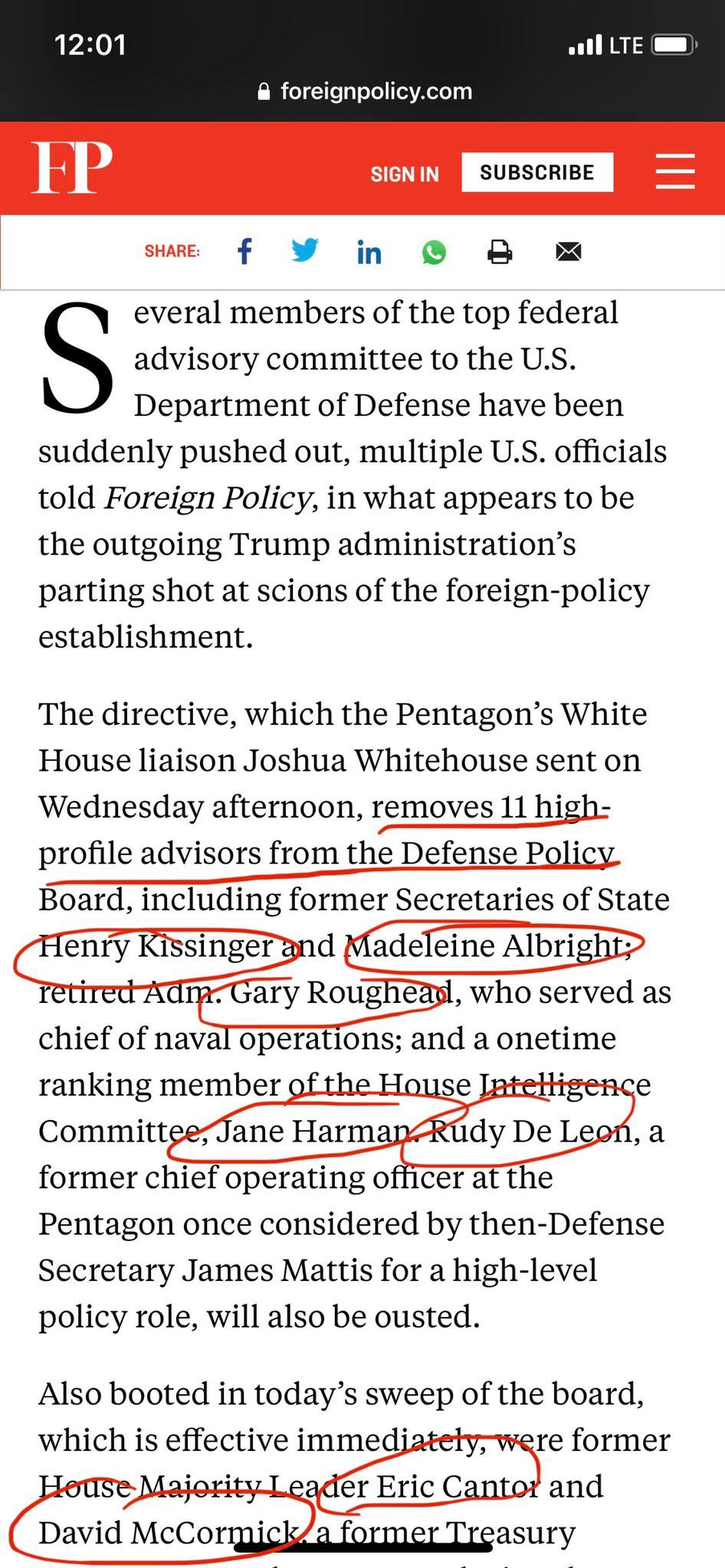 26/11 Chiều nay, Trump đã sa thải 11 thành viên cố vấn của Bộ Quốc phòng, bao gồm Kissinger, Albright, Gary Rowe Head, Rudy Lyon và những người khác. Nhiều người trong số họ là các quan chức cấp cao cốt lõi của bộ phận tình báo và hải quân trước đây, cũng như các nhà hoạch định chính sách cốt lõi của Bộ Quốc phòng thời Bush và Clinton.