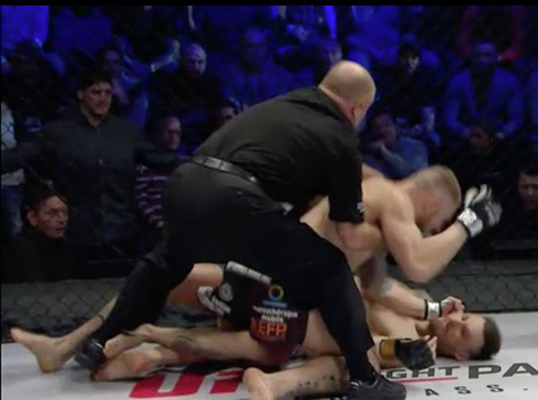 Mặc dù trọng tài đã ngăn cản nhưng võ sĩ MMA Strahinja Gavrilovic vẫn liên tiếp tung những cú đấm vào mặt Jo Vallee.