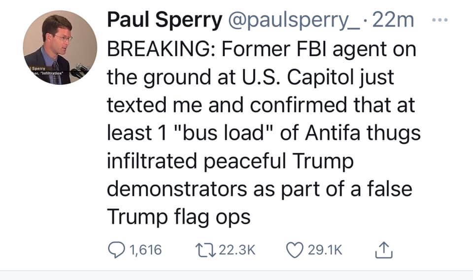 “Cựu nhân viên FBI có mặt tại US Capitol vừa nhắn tin cho tôi và xác nhận rằng ít nhất 1 xe bus lớn chở những tên côn đồ Antifa đã trà trộn vào đoàn người đang biểu tình ủng hộ Trump ôn hoà, như là một phần của họ với cờ pro- Trump giả mạo .”