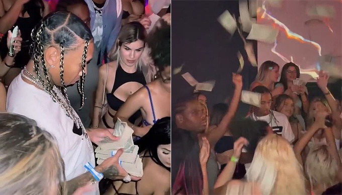 Tyga được biết tới có sống phóng túng, chơi bời. Hồi tháng 11/2020, anh mừng tuổi mới trong hộp đêm chỉ toàn chân dài nóng bỏng. Tại đây, anh đã cầm cọc tiền lớn, liên tục rút và ném lên không trung. Các cô gái xung quanh chỉ việc nhún nhảy theo nhạc và bắt lấy những tờ USD đó. Vụ việc bị dân mạng chỉ trích gay gắt vì Tyga mở tiệc giữa thời dịch, coi thường khuyến cáo của ngành y tế. Ảnh: Chụp màn hình.