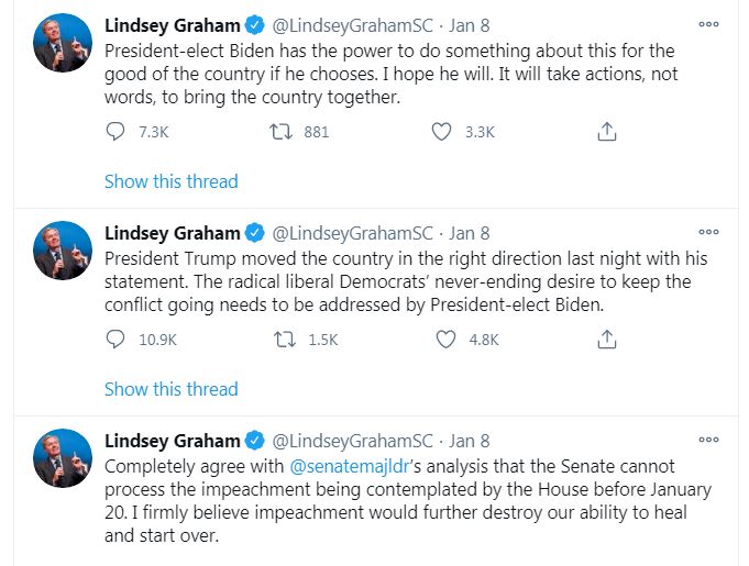 Trong một loạt bài đăng trên Twitter, ông Graham nói: “Twitter có thể cấm tôi vì điều này nhưng tôi sẵn sàng chấp nhận nó: Quyết định cấm vĩnh viễn Tổng thống Trump của các bạn là một sai lầm nghiêm trọng. Ayatollah có thể tweet, nhưng ông Trump thì không. [Điều này] cho thấy rất nhiều thứ về những người điều hành Twitter".