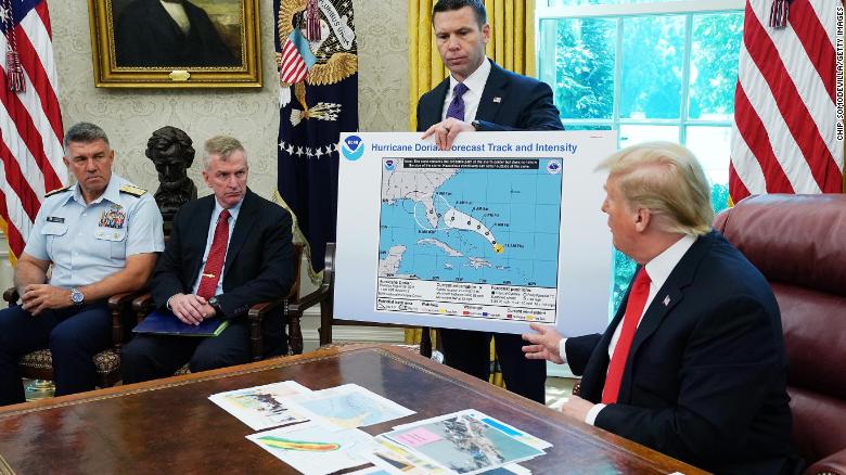 Trump tham khảo bản đồ do quyền Bộ trưởng Nội an Kevin McAleenan cầm trong khi nói chuyện với các phóng viên về cơn băo Dorian trong Pḥng Bầu dục tại Bạch Cung ngày 4 tháng 9 năm 2019 ở Washington, DC. CNN