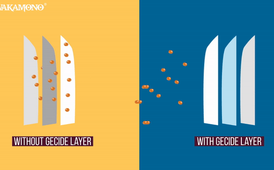 Nhờ lớp vải Gecide, khẩu trang Wakamono sẽ tiêu diệt virus Corona chứ không che chắn đơn thuần như những khẩu trang y tế thông thường. Bằng cách này, tình trạng lây nhiễm chéo trong cộng đồng (do virus Corona có khả năng sống sót tới 7 ngày trên khẩu trang) có thể được giảm thiểu đáng kể.