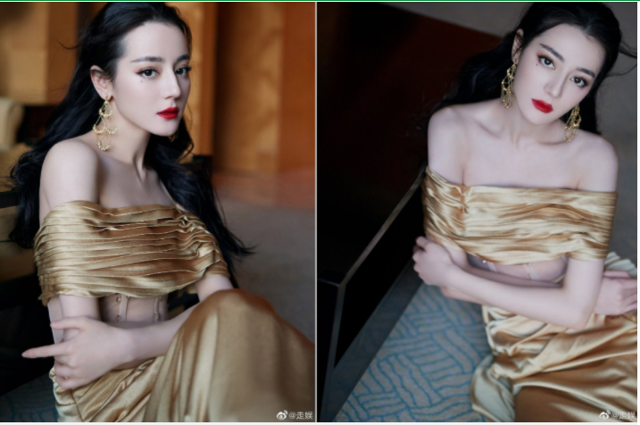 Nhan sắc Địch Lệ Nhiệt Ba được fan khen ngợi xinh đẹp tựa nữ thần khi diện bộ váy màu vàng trễ vai gợi cảm.
