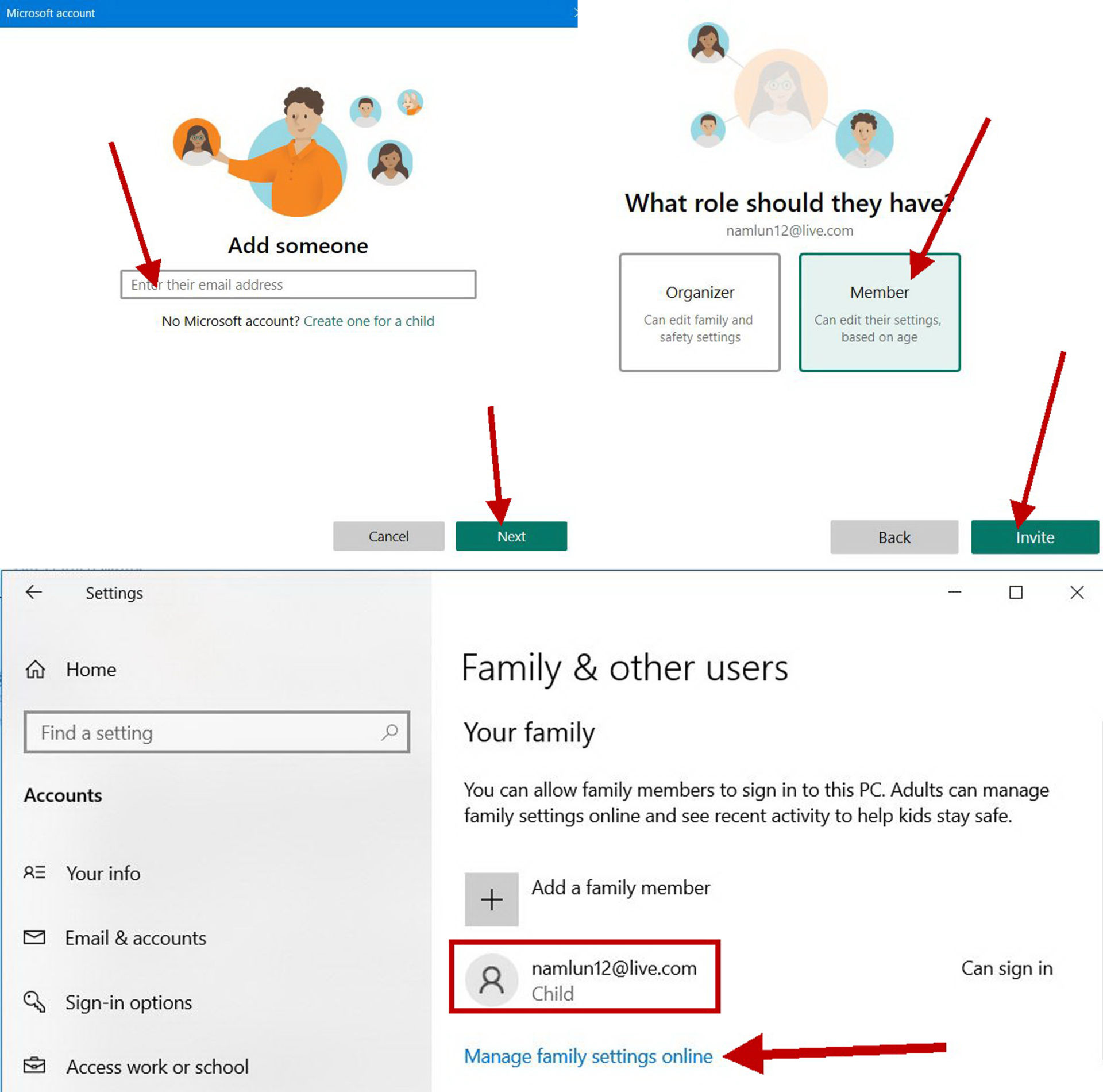 -Trong trang tiếp theo, bạn chọn loại thành viên là Member rồi bấm nút Invite. Windows sẽ gửi thư yêu cầu xác nhận tham gia vào family đến địa chỉ email của trẻ.