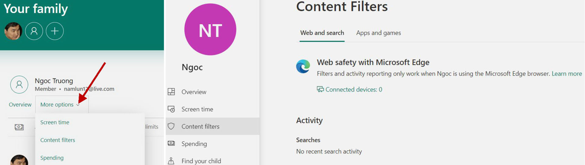 -Trong menu thả xuống của mục More options có các thiết lập để bảo vệ trẻ như: Screen Time (quản lý thời gian), Content Filters (lọc nội dung web, app và game), Spending (mua hàng).