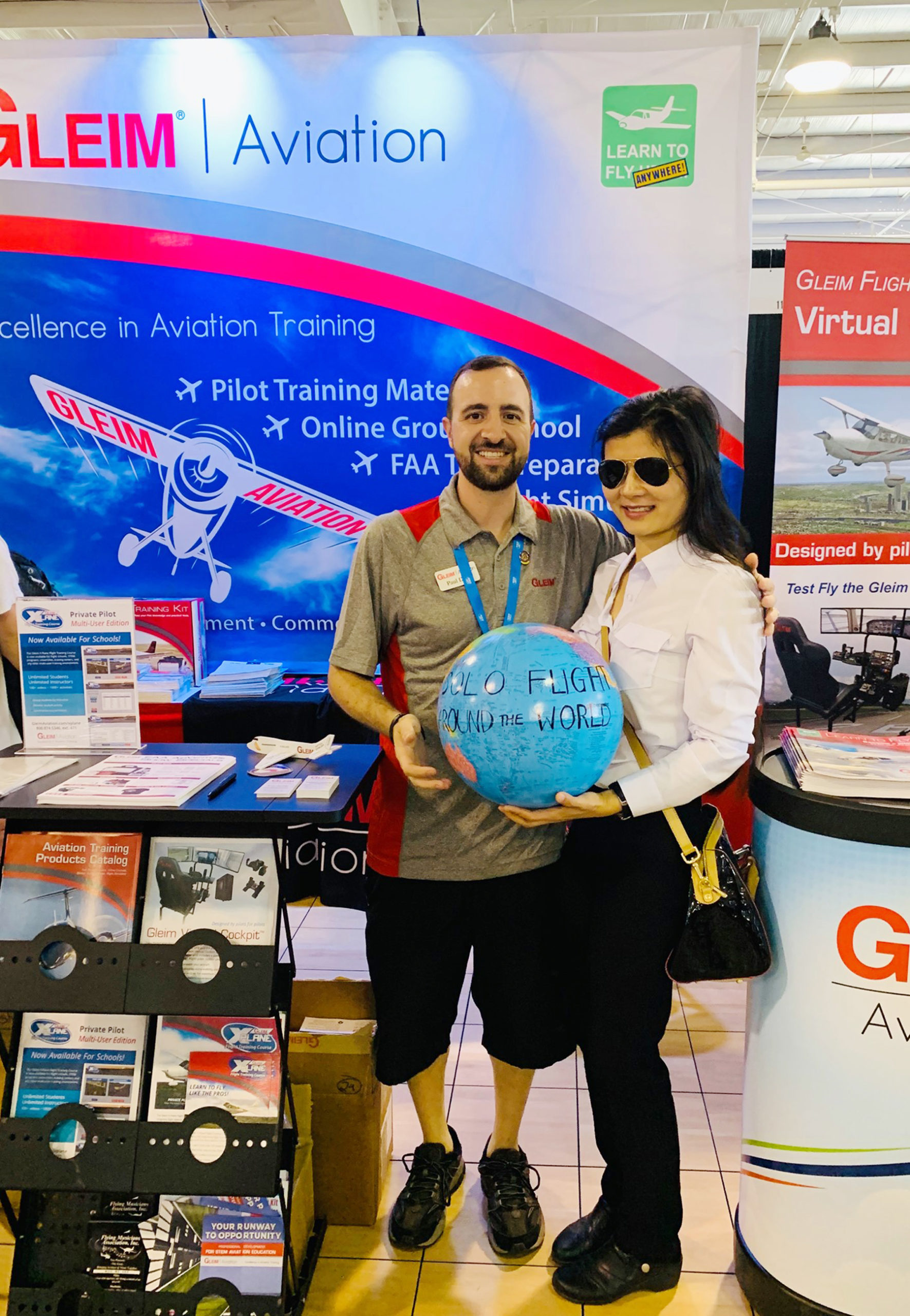 Nữ phi công Nguyễn Anh Thư (phải) và đại diện Gleim Aviation – một trong những nơi tài trợ cho chuyến phiêu lưu vòng quanh thế giới của cô. (Hình: Facebook Anh-Thu-Nguyen)