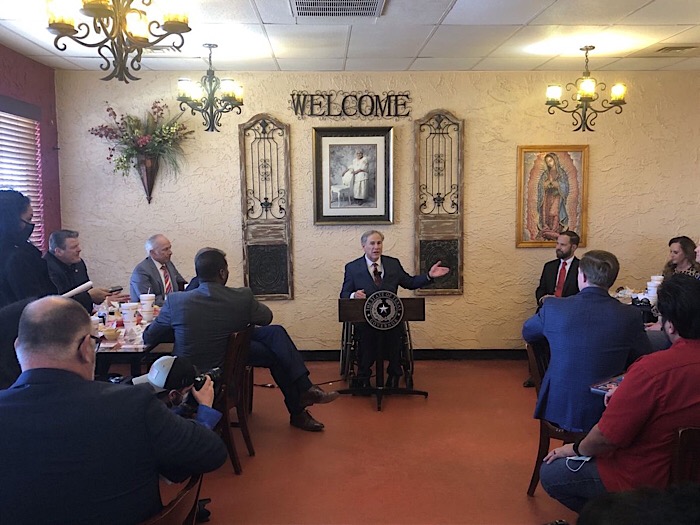 Thống đốc Texas Greg Abbott cho biết trong một cuộc họp báo tại Nhà hàng Mexico của Montelongo ở Lubbock rằng ông sẽ ban hành một lệnh hành pháp mới bãi bỏ hầu hết các hạn chế Covid-19 trước đây của mình, bao gồm cả nghĩa vụ đeo khẩu trang trên toàn tiểu bang. Ông nói thêm rằng tất cả các doanh nghiệp sẽ được phép mở cửa "100%", có hiệu lực từ ngày 10 tháng 3.