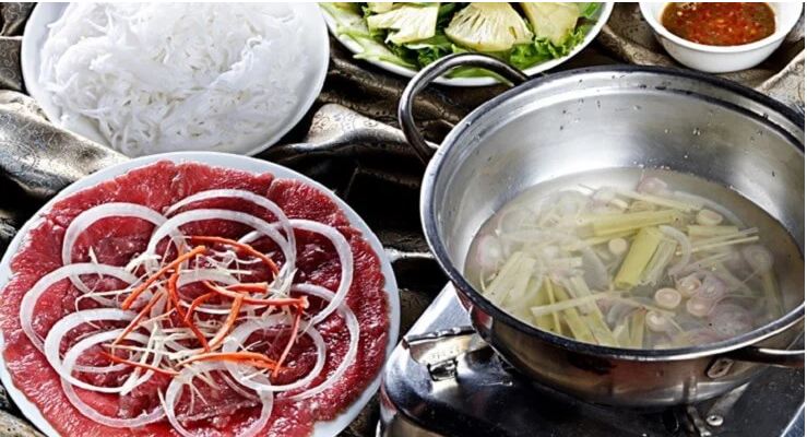 Đặt nồi nước dùng lên bếp ga mini ở giữa bàn. Lúc này, bạn chỉ cần đợi nước dùng sôi, nhúng bò chín tái, cuốn cùng bánh tráng, bún, rau, chấm với mắm nêm.