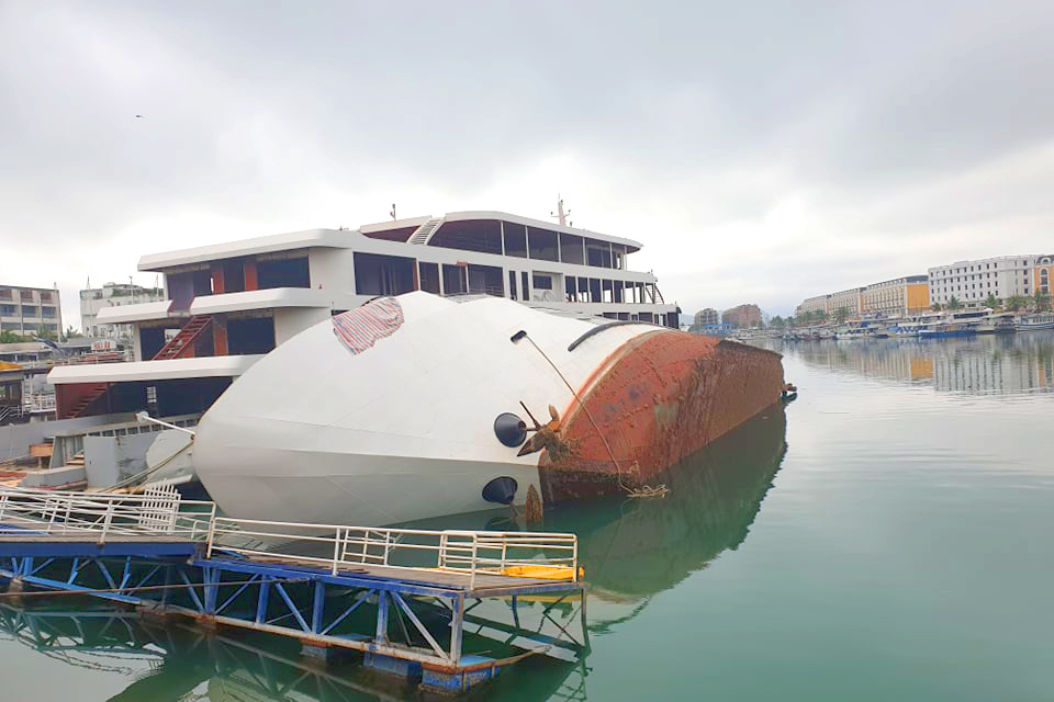 Du thuyền Halong Aquamarine bất ngờ lật ngang khi đang neo đậu tại cảng tàu Tuần Châu.