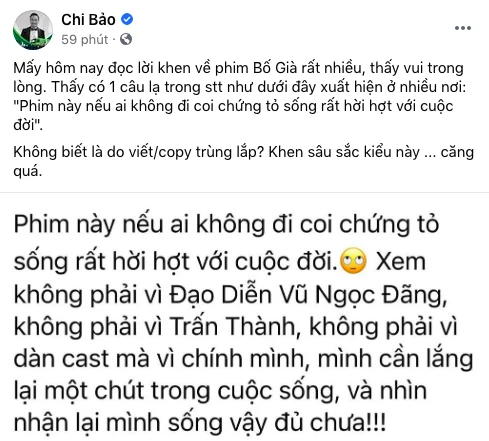 Giữa làn sóng tranh cãi đang bùng nổ ở các diễn đàn, diễn viên Chi Bảo bất ngờ chia sẻ hình ảnh chụp đoạn viết của Hồ Ngọc Hà và cho biết: "Mấy hôm nay đọc lời khen về phim "Bố già" rất nhiều, thấy vui trong lòng.