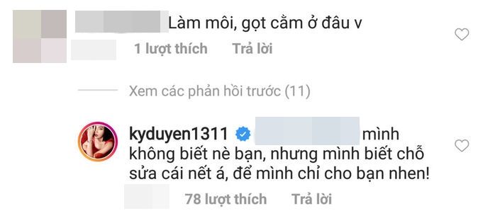 Một lần khác, nàng Hậu lại tiếp tục bị một cư dân mạng công kích: "Làm môi, gọt hàm ở đâu". Điều này khiến Kỳ Duyên khó chịu và tỏ thái độ cáu gắt: "Không biết nè bạn, nhưng mình biết chỗ sửa nết á, để mình chỉ cho bạn nhen".