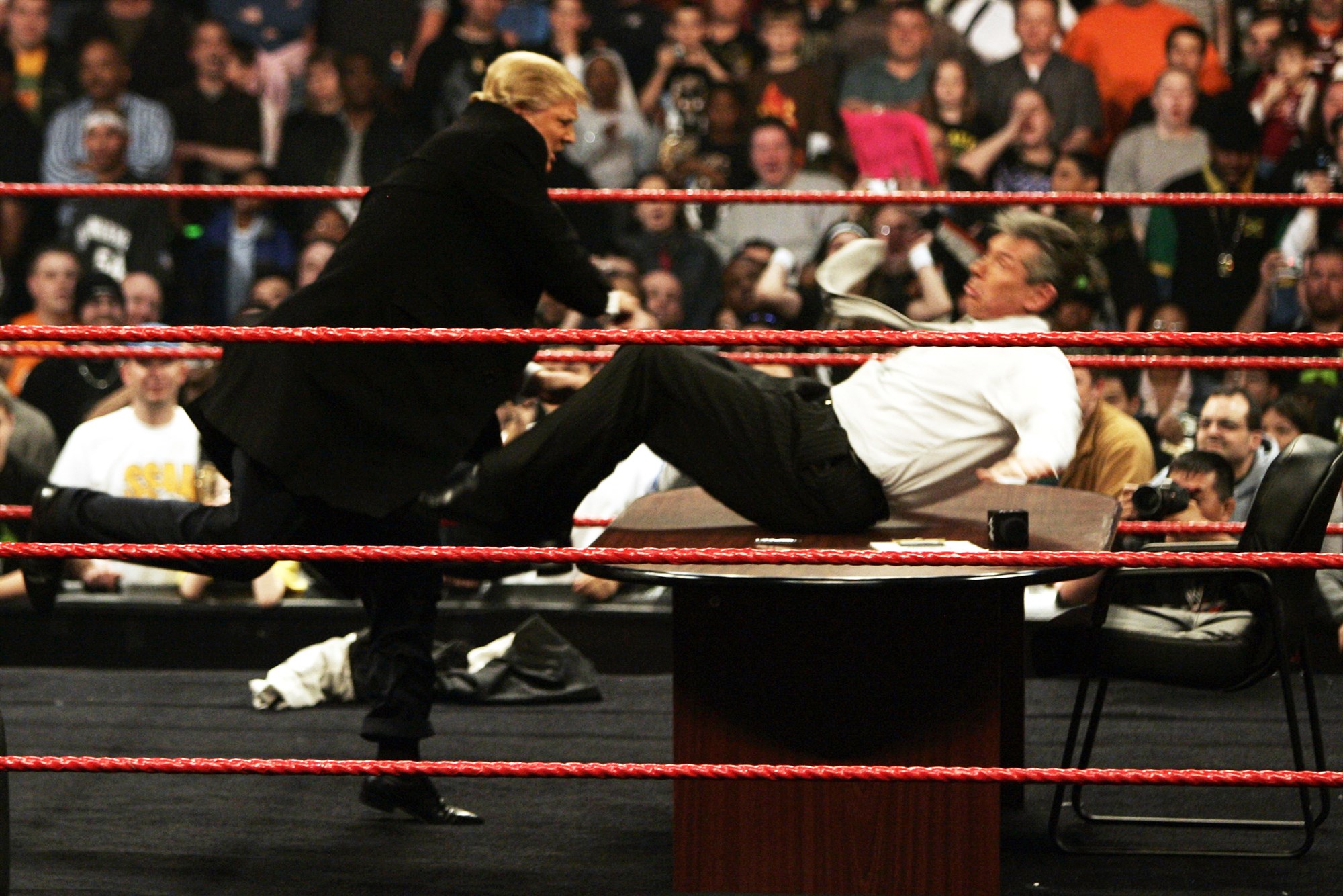 Vince McMahon nhận được nhiều hơn những ǵ anh ta mong muốn khi Donald Trump trở nên khỏe mạnh sau khi kư hợp đồng cho trận đấu "Hair vs Hair" của Wrestlemania XXIII ở Washington vào ngày 12 tháng 3 năm 2007.Sam Greenwood / WireImage cho WWE qua Getty Images