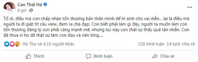 Trước áp lực dư luận, Cao Thái Hà đã phải tạm khoá Facebook. Mới đây nhất, nữ diễn viên mở lại trang cá nhân đồng thời đăng dòng trạng thái vô cùng xót xa: "Tổ ơi, điều mà con chấp nhận tổn thương bản thân mình để hi sinh cho vai diễn... lại là điều mà người ta đi giật tít câu view, đem ra chà đạp. Con biết phải làm gì đây, người ta muốn làm con tổn thương đáng lý con phải càng mạnh mẽ, nhưng lúc này con thật sự thấy quá tàn nhẫn. Con đã thua vì họ đã thật sự làm con đau và nãn lòng....".