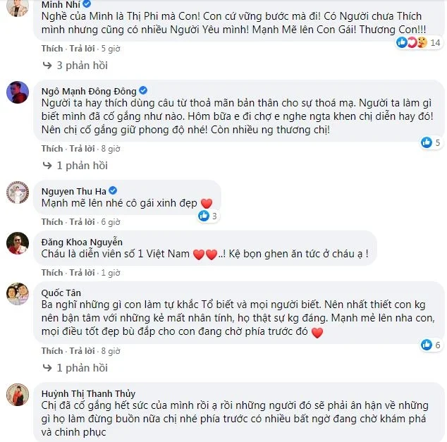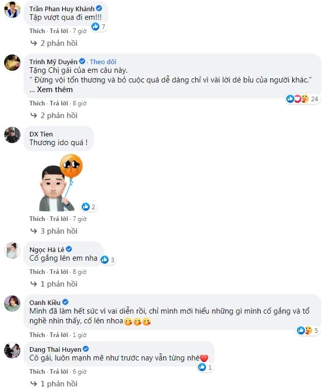 Bên dưới dòng chia sẻ này, rất nhiều bạn bè, đồng nghiệp đã gửi lời động viên, an ủi nàng 'Hoạn Thư'. "Em đã làm rất tốt và hy sinh hết mình cho vai diễn. Chắc chắn sẽ không có ai thể hiện tốt vai Hoạn Thư hơn em đâu nên em hãy bỏ ngoài tai tất cả những lời khiến em tổn thương nhé. Tất cả những người có tâm, có nghề đều luôn dành cho em sự trân trọng và mọi người sẽ luôn bên em và yêu thương em", đạo diễn Mai Thu Huyền nhắn nhủ.