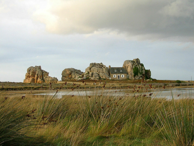 Một ngôi nhà nhỏ bằng đá ở Plougrescant, Pháp, được xây dựng vào năm 1861 tại một vị trí bấp bênh ở mũi bán đảo.