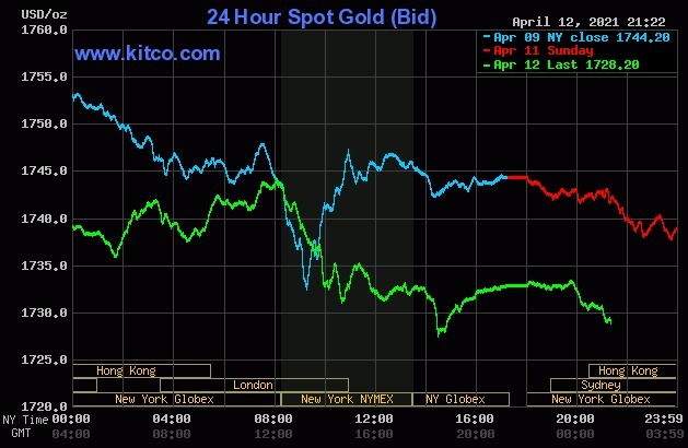 Chốt phiên giao dịch 12/4, giá vàng thế giới giao ngay giảm hơn 11 USD, về 1.732 USD một ounce. Nguyên nhân là lợi suất trái phiếu Mỹ tăng gây sức ép lên kim loại quý. Nhà đầu tư cũng đang chờ đợi các số liệu chủ chốt về lạm phát và doanh số bán lẻ để đánh giá sức khỏe nền kinh tế lớn nhất thế giới.