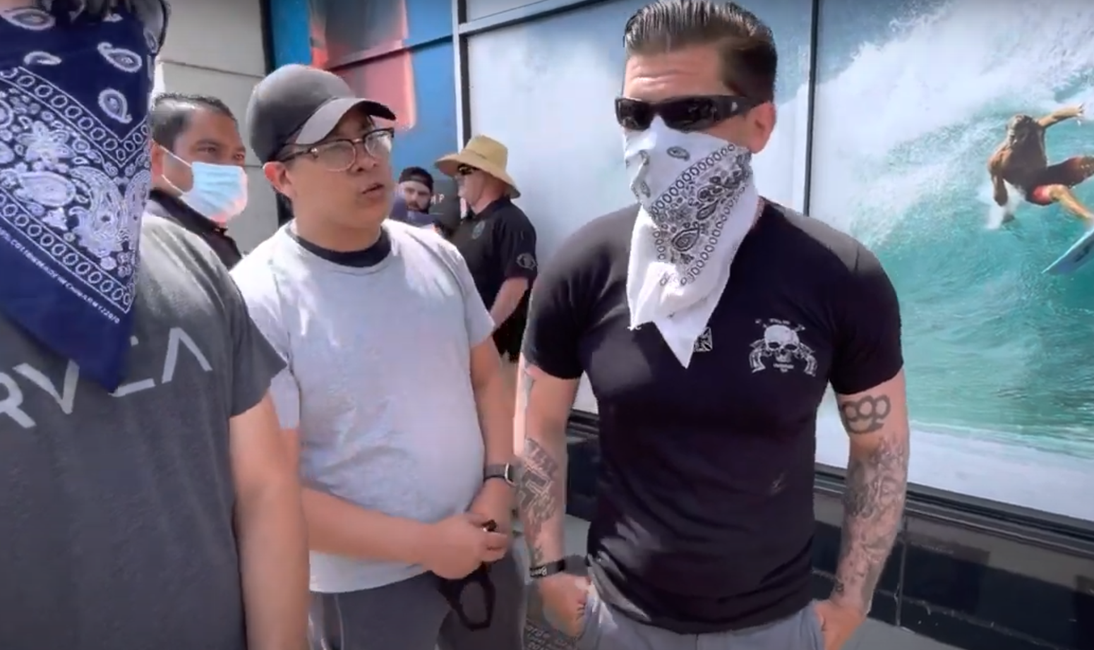 Một người đàn ông da trắng, xăm hình chữ thập ngoặc của Đức Quốc Xã trên cánh tay tấn công một thanh niên gốc Á tại cuộc tập hợp “white lives matter” (mạng người da trắng cũng đáng kể) diễn ra tại Huntington Beach, California hôm Chủ Nhật, 11 Tháng Tư, khiến bị cảnh sát bắt giữ người đàn ông da trắng này.
