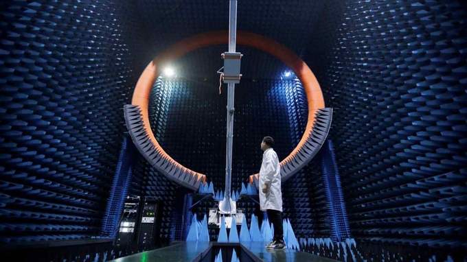 Một kỹ sư đứng dưới ăng-ten 5G của trạm gốc tại trung tâm sản xuất Huawei ở Đông Quan, Trung Quốc. Ảnh: Reuters.