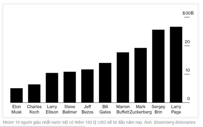 Nhóm 10 người giàu nhất nước Mỹ có thêm 150 tỷ USD kể từ đầu năm nay. Ảnh: Bloomberg Billionaires Index.