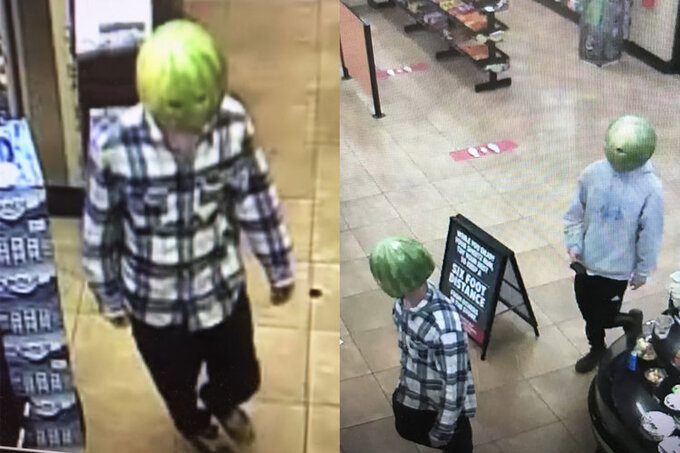 Quản lý cửa hàng tiện lợi Sheetz ở thị trấn Louisa, bang Virginia, lại không quên được vụ trộm kỳ quặc xảy ra tháng 5/2020. Hôm đó, camera ghi lại cảnh 2 thanh niên đội trên đầu quả dưa hấu khoét ruột, chỉ lộ 2 con mắt và đi vòng vòng trong cửa hàng trước khi thó mấy chai rượu.