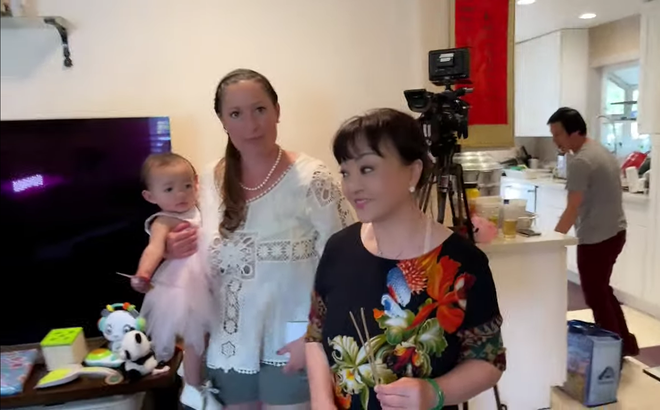Điều đặc biệt trong bữa tiệc thôi nôi mà khán giả thấy được là sự lộ diện con dâu người Mỹ của danh ca Hương Lan.
