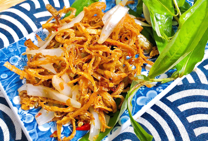 Khô mực chiên mắm đường có vị mặn ngọt, ăn cùng cơm hoặc dùng làm món nhắm đều hợp.