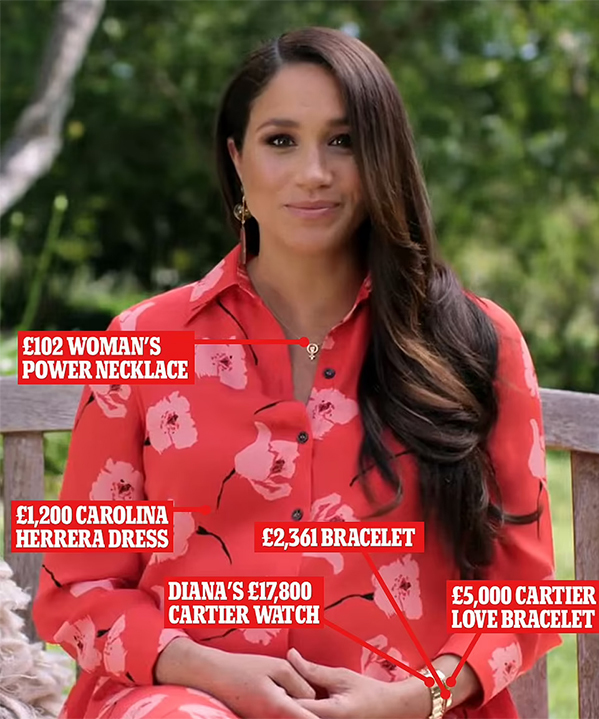 Khi ghi hình trong khuôn viên dinh thự trị giá gần 15 triệu USD ở Montecito, California, nữ công tước xứ Sussex mặc váy sơ mi Carolina Herrera 1.200 bảng, đeo đồng hồ Cartier 17.800 bảng của Công nương Diana, kèm vòng tay Cartier Love 5.000 bảng, vòng tay vàng 2.361 bảng và vòng cổ 102 bảng. Tổng giá trị trang phục và phụ kiện lần này của vợ Hoàng tử Harry cán mốc 26.463 bảng (870 triệu đồng).