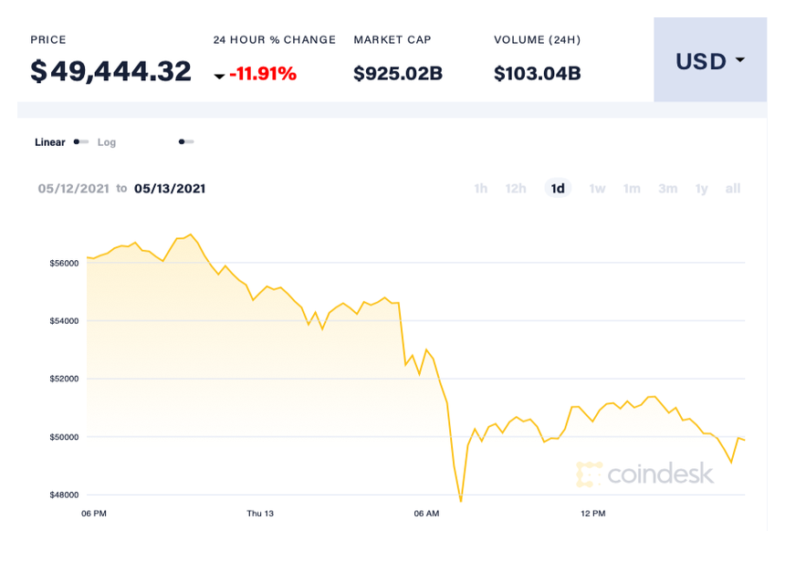 Tính đến 17h30 ngày 13/5 (theo giờ Việt Nam), giá Bitcoin đã mất mốc 50.000 USD/đồng. Ảnh: Coin Desk.