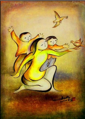 Tranh của Bé Ký lấy tuổi thơ làm quê hương.
