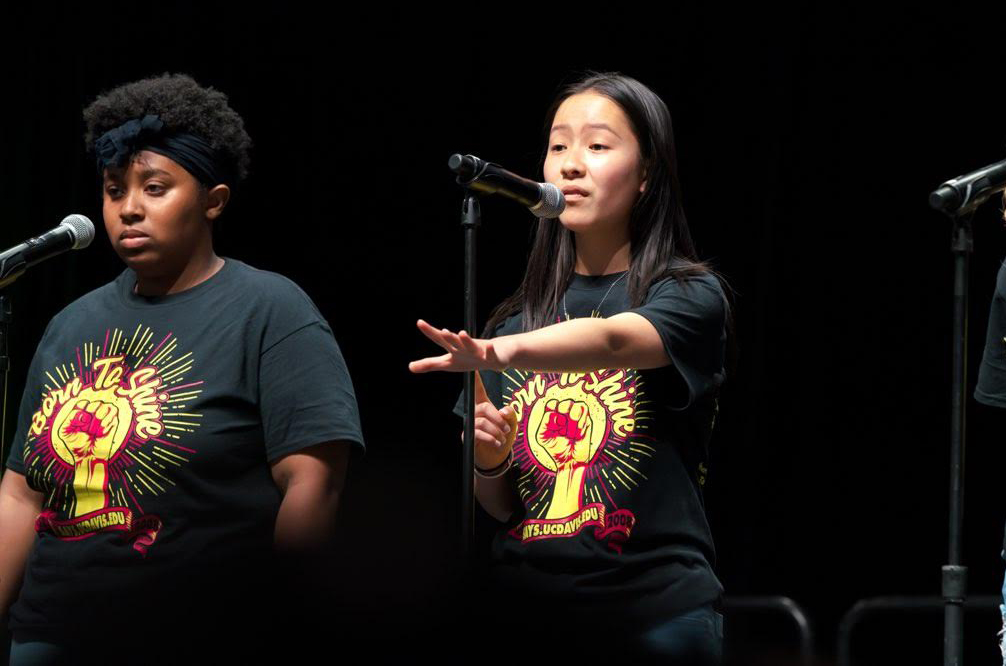 Cô Alexandra Huỳnh (phải) trong lần biểu diễn tại cuộc thi thơ “Sacramento Area Youth Speaks” năm 2019. (Hình: Alexandra Huỳnh cung cấp)