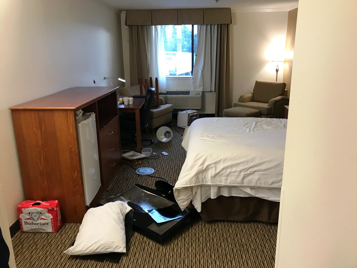 Theo như tin của báo mạng địa phương The Jolt News cho biết một ông gốc Việt đã giật phá tung tóe đồ đạt trong phòng khách sạn mà ông đã thuê vào đêm thứ Ba, 25 tháng 5, 2021 vừa qua. Nhưng không rõ vì sao một ông gốc Việt sống tại Olympia, tiểu bang Washington đã có hành động nổi nóng, mất bình tĩnh như người bị bệnh tâm thần hay người hít xì ke.