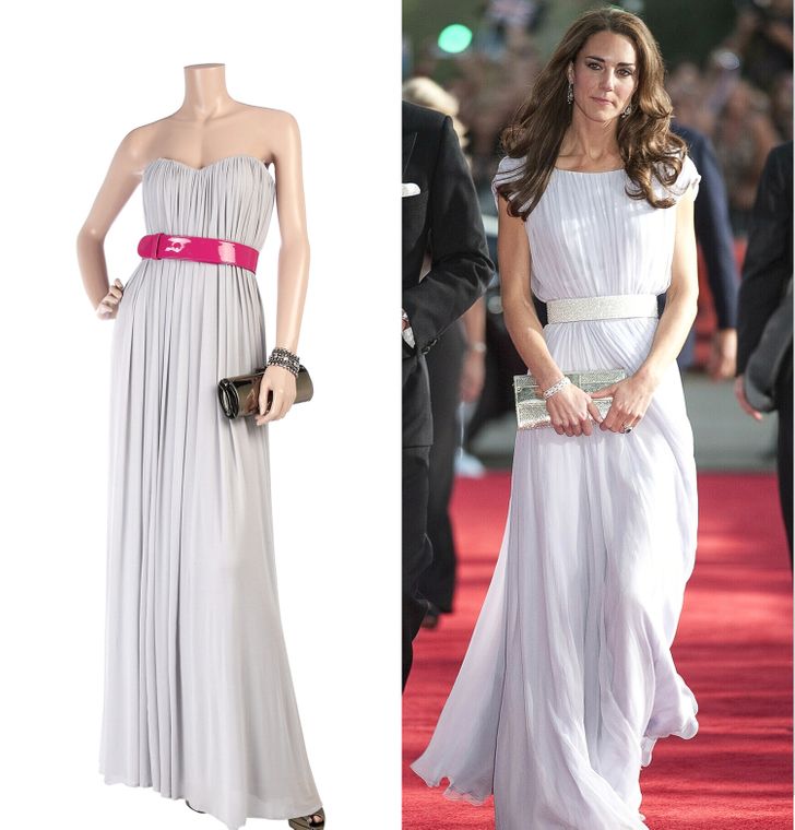 Vào tháng 11 năm 2011, Kate mặc một chiếc váy lệch vai đến từ một trong những thương hiệu yêu thích của cô là Jenny Packham. Màu sắc của trang phục đã được thay đổi theo yêu cầu của công nương. Phiên bản gốc là chiếc váy đỏ được Angelina Jolie mặc tại buổi ra mắt phim “Tree of Life”. Còn chiếc váy của Kate được thay đổi sang màu xám rất nhã nhặn và sang trọng.