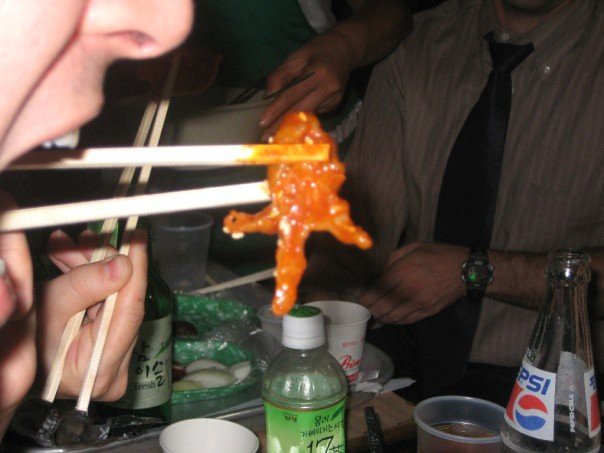 Hãy bắt đầu danh sách này với loại sashimi kì lạ nhưng nổi tiếng của Hàn Quốc: Sannakji. Từ “san” trong tên của nó có nghĩa là sống và “nakji” có nghĩa là bạch tuộc. Món ăn này thường được bán trên đường phố và nhiều nhà hàng hải sản. Hãy tưởng tượng loại động vật thân mềm này với kết cấu nhầy nhụa vẫn di chuyển bằng các xúc tu, đang cuộn qua cổ họng khi bạn nuốt nó. Chắc hẳn là một cảm giác… khó đỡ.