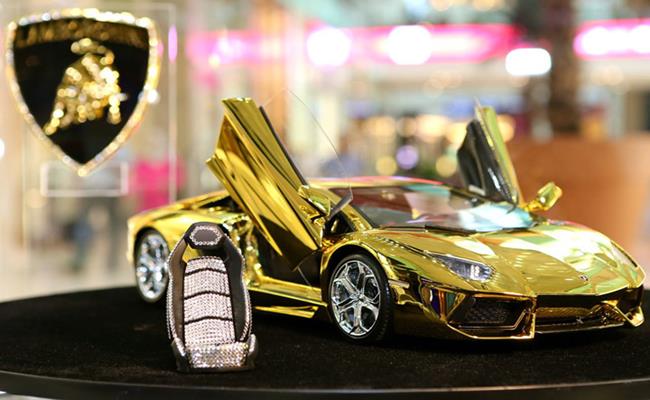 Chiếc Lamborghini Aventador mô hình này được làm bằng sợi carbon kết hợp với vàng ròng, ngoài ra xe còn sử dụng nhiều nguyên liệu đắt đỏ khác như bạch kim hay kim cương.