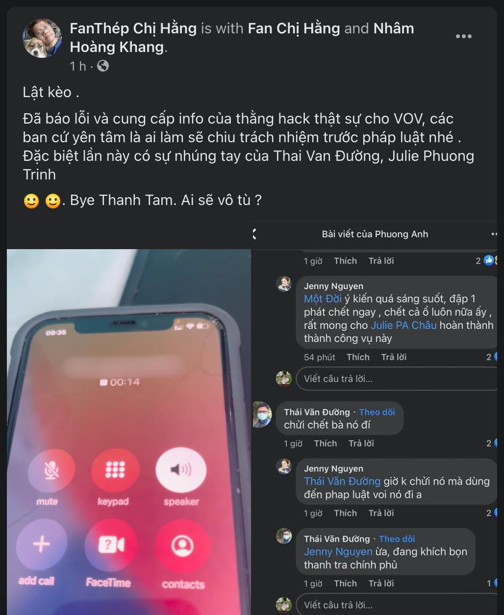 Anh cho biết: “Lật kèo. Đã báo lỗi và cung cấp info của thằng hack thật sự cho VOV, các bạn cứ yên tâm là ai làm sẽ chiu trách nhiệm trước pháp luật nhé! Đặc biệt lần này, có sự nhúng tay của Thai Van Đường, Julie Phuong Trinh. Bye Thanh Tam. Ai sẽ vô tù?”