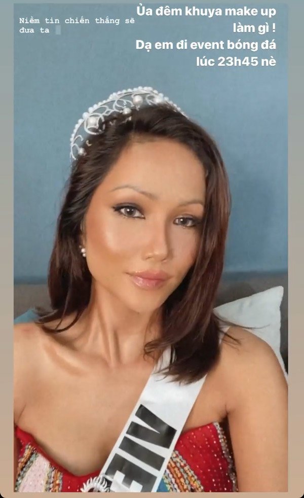 Nàng Hậu cho biết: “Ủa cả nhà 23h45 Hen có event nè. Mọi người chuẩn bị thay đồ tóc tai xinh đẹp chưa vậy? Hen thì xong rồi mọi người tranh thủ lẹ lẹ nha. Event này mùa dịch nên trong nhà có đồ gì mặc đồ đó, hên ghê có bộ đồ xinh đẹp màu đỏ, đeo sash Việt Nam là biết Hen bắt đội Việt Nam đó! Hôm nay thắng lợi nha Việt Nam dấu yêu, mở tivi lên chuẩn bị thôi”.