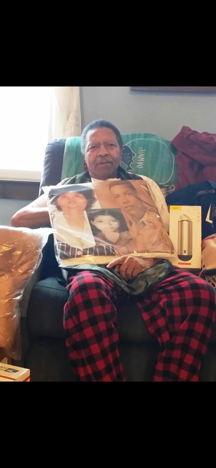 Ông Richard Lee Snowden với quà tặng do vợ ông tặng cho hai cha con ông, chiếc áo gối hình ông cùng con gái và mẹ ruột của con gái ông.