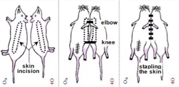 Đầu tiên là ghép chuột đực đã bị thiến và chuột cái thành một cơ thể chung. Bước hai là cấy tử cung của một con chuột cái khác (không phải con ghép với con đực) vào cơ thể con đực trước khi cấy phôi vào cả con đực và con cái.