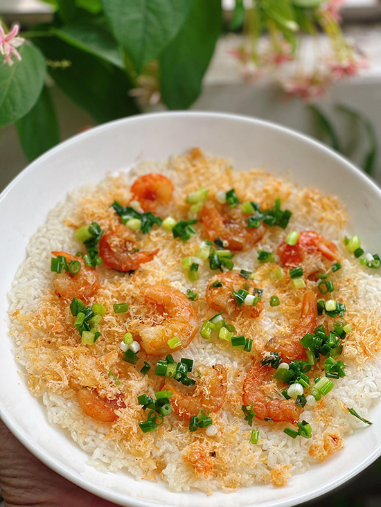 Món cơm cháy nên thưởng thức khi còn nóng hổi giòn rụm. Phần tôm rim dai dai, tôm chấy bông tơi thơm ngọt, nước sốt đậm đà, mỡ hành thơm phức.