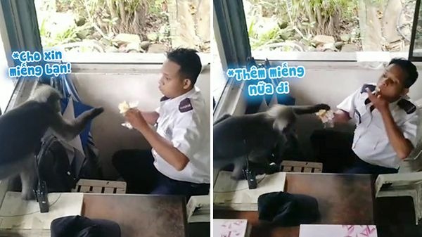 Khỉ cướp chuối của anh bảo vệ. Anh bảo vệ đang ăn quả chuối ngon lành thì con khỉ từ đâu chạy đến, giật lấy món khoái khẩu của mình một cách trắng trợn.