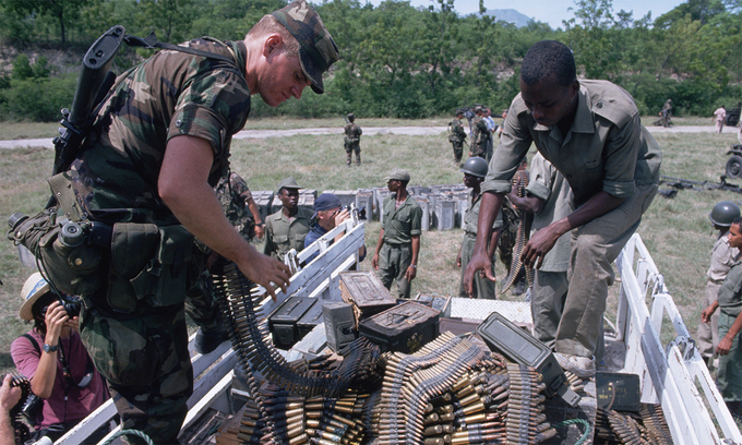 Một binh sĩ Mỹ (trái) và Haiti dỡ đạn từ thùng xe tải năm 1994. Ảnh: VCG.