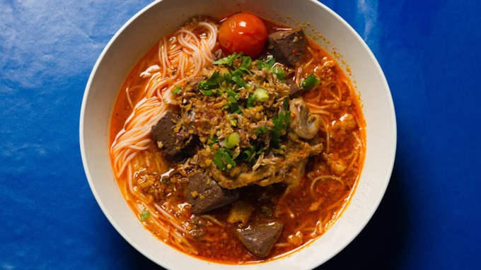 Món mì đặc biệt này không ăn kèm nước cốt dừa hay bột cà ri như những món ăn khác. Nó ăn cùng thịt băm nhỏ, cùng đậu nành lên men, giá đỗ và ớt khô. Theo đánh giá của Austin, món ăn này tuyệt vời đến mức thực khách chỉ buông đũa sau khi đã ăn hết.
