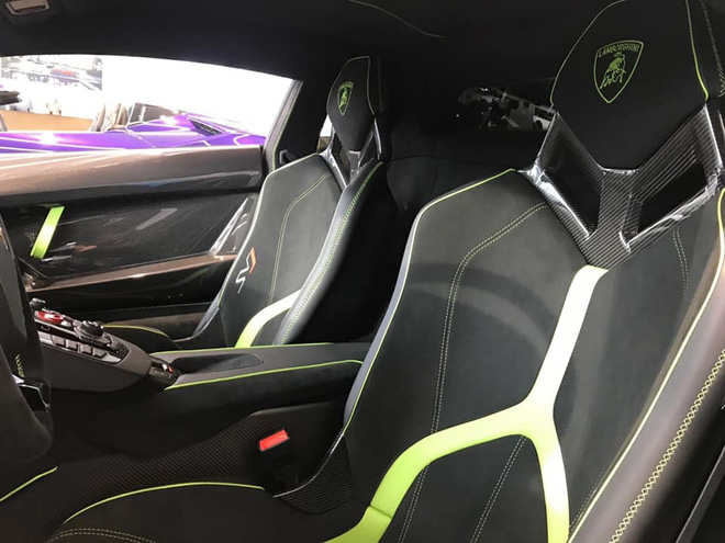 Nội thất Lamborghini Aventador SVJ thứ 4 tại Việt Nam có tông đen chủ đạo, xen kẽ là sọc kẻ màu xanh lá cây ở chính giữa phần ghế ngồi. Hai bên sườn ghế được thêu logo SVJ. Đáng chú ý, loại ghế được trang bị trên chiếc xe này là loại ghế đua được làm từ sợi carbon. Đây là loại ghế được cho là ngồi rất cứng, phù hợp khi sử dụng trong đường đua.