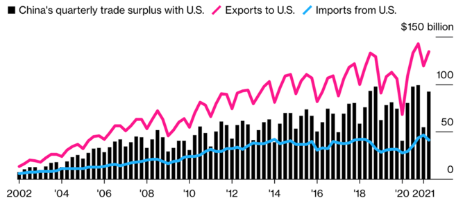 Hoạt động thương mại nhộn nhịp trở lại bất chấp dự đoán thuế quan với hàng trăm tỷ USD hàng hoá Trung Quốc sẽ buộc chia tách các chuỗi cung ứng. Tuy nhiên, cả hai bên đã học được cách chung sống với các loại thuế. Các công ty Trung Quốc mua nhiều hơn để đáp ứng các điều khoản của thoả thuận thương mại năm 2020. Trong khi, phía Mỹ mua hàng hoá mà không thể mua ở nơi khác để đáp ứng nhu cầu của các hộ gia đình gia tăng - nhờ gói kích thích hàng nghìn tỷ USD của chính phủ.