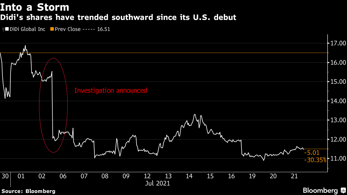 Hôm 1/7, giá cổ phiếu của công ty tăng khoảng 16%. Một ngày sau đó, ban lãnh đạo công ty bắt đầu ăn mừng. Nhưng đến tối cùng ngày, CAC đăng thông báo trên trang web về cuộc điều tra với Didi để "bảo vệ an ninh quốc gia và lợi ích cộng đồng".