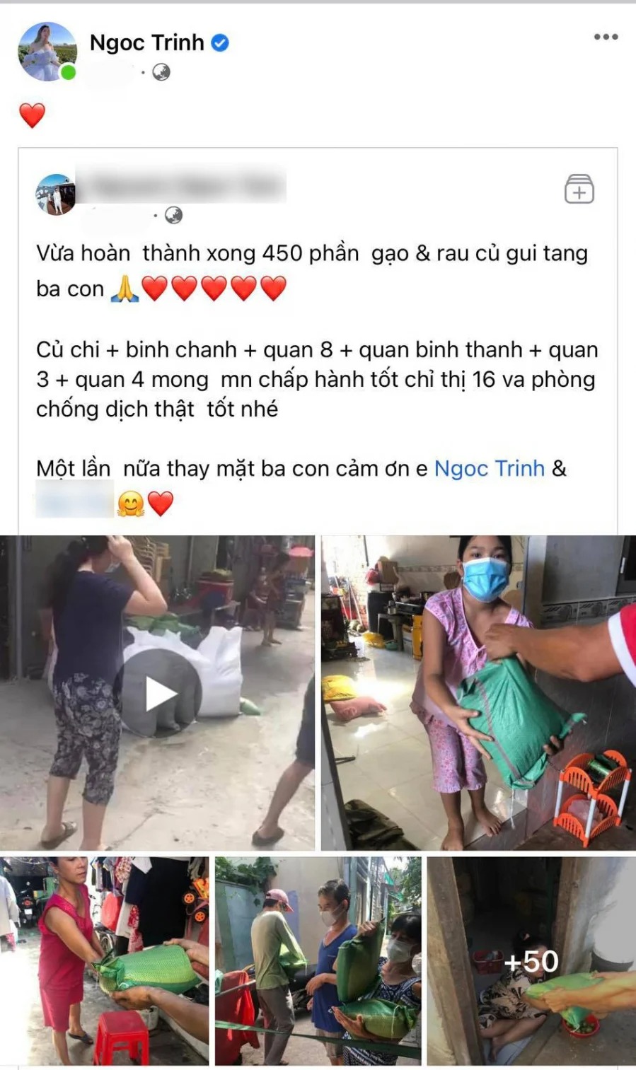 Mới đây, Ngọc Tâm – bạn thân của Ngọc Trinh liên tục đăng tải bài viết cập nhật về công tác từ thiện và cảm đã mang đến những phần quà này. Cô đã cùnga đồng nghiệp thân thiết gửi hàng trăm phần gạo, rau củ tặng cho những bà con khó khăn trên địa bàn thành phố. Nhóm từ thiện đã đem 450 phần quà gồm gạo và rau củ phát cho nhiều hộ dân ở Củ Chi, Bình Thạnh, quận 8, quận 3, quận 4.