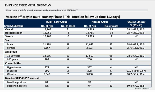 - Dữ liệu công bố trên WHO (không phải dữ liệu gốc) cho thấy vaccine TQ còn nhiều điểm chưa rõ ràng, nhất là phần thiết kế nghiên cứu và mất cân bằng trong dữ liệu (ít thử nghiệm nhóm bệnh trên trên 60 tuổi là nhóm có rủi ro cao nhất trong dịch Covid-19 )