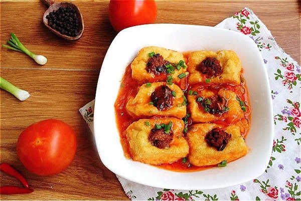 Cách làm: Bạn hãy cắt đậu phụ thành từng miếng 3-4cm, rồi khoét một lỗ nhỏ trên bề mặt miếng đậu phụ cho thịt xay vào đó. Tiếp theo, bạn bắc chảo cho dầu ăn rán vàng những miếng đậu phụ đã được nhồi thịt. Sau khi rán đậu xong bạn gắp chúng ra đĩa. Bạn vẫn dùng chảo đó, thêm ít dầu ăn rồi cho cà chua cắt miếng nhỏ thêm chút nước sôi rồi thả đậu phụ đã rán vàng vào, thêm gia vị cho vừa miếng. Sau cùng bạn rắc thêm chút hành lá thái nhỏ vào là được.