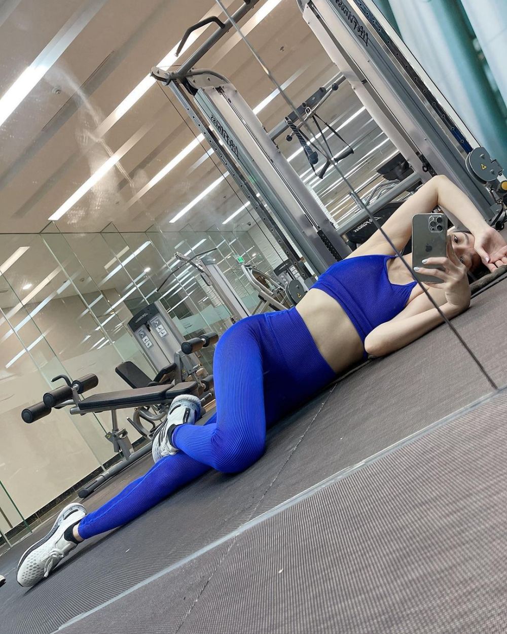 Lệ Quyên diện đồ tập, nằm "check - in" ở phòng gym.